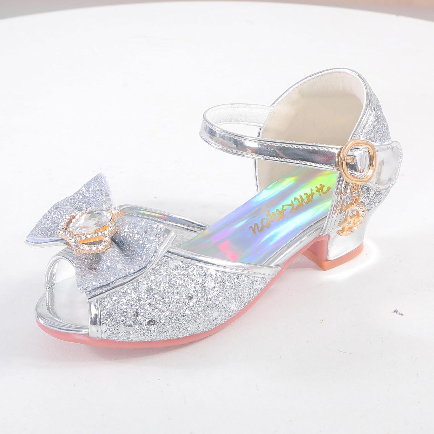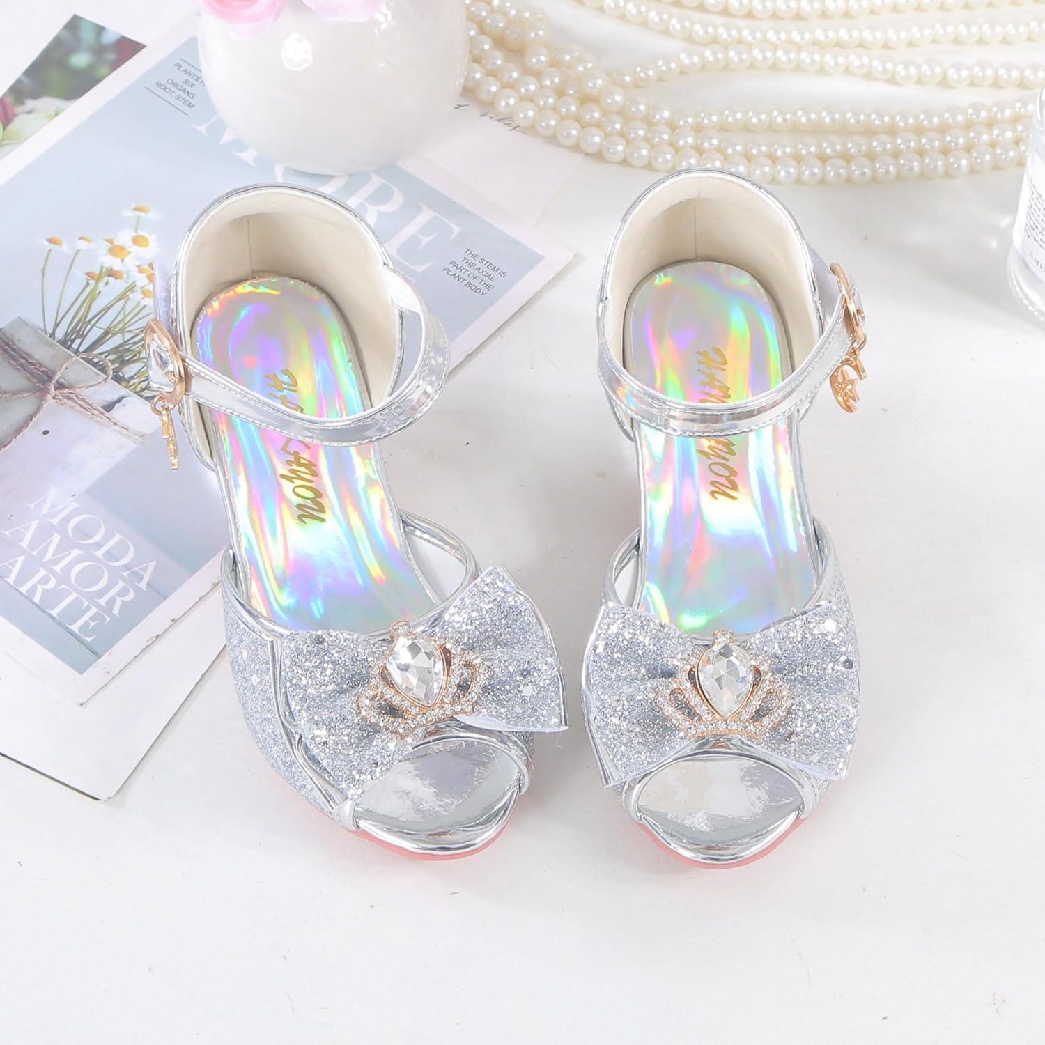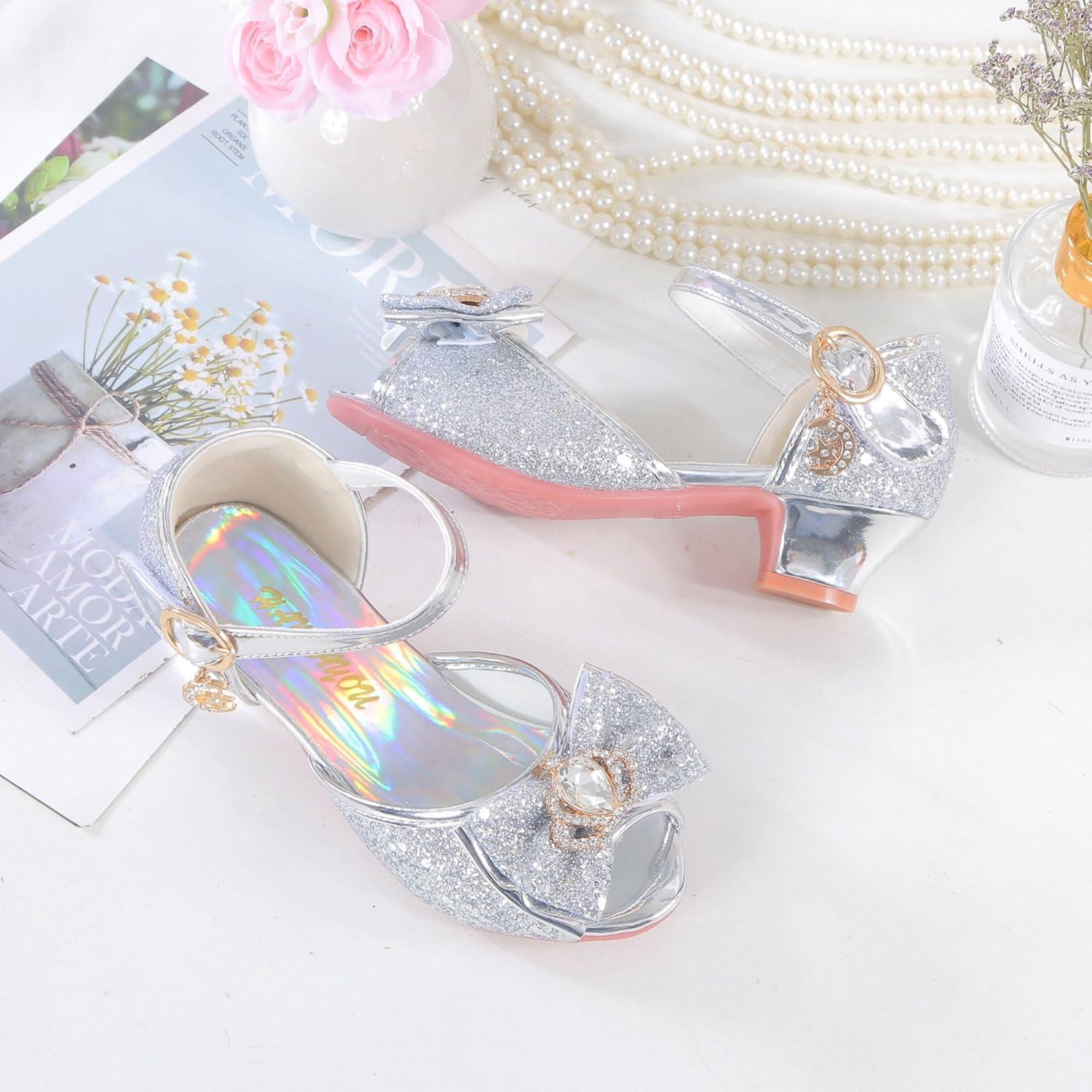 Girls Shoes Sparkle Mary Jane Low Heel Princess Flower Wedding Party Dress Shoes(K1-silver)